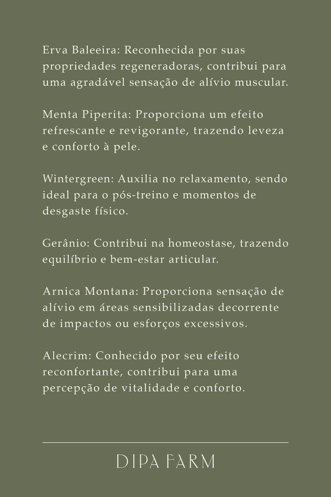 Com textura leve, macia e de rápida absorção, o Bálsamo de Revitalização Muscular DIPA é inspirado em métodos ancestrais de cuidado natural. Sua fórmula contém ingredientes de origem natural, livre de parabenos, silicones, ingredientes sintéticos e cruelty-free, e combina o poder terapêutico da Erva Baleeira a óleos essenciais de Menta Piperita, Wintergreen, Gerânio, Alecrim e extrato de Arnica Montana, cuidadosamente selecionados. Ideal para o uso após atividades físicas, promove uma agradável sensação de conforto muscular, além de proporcionar relaxamento e alívio para o corpo.